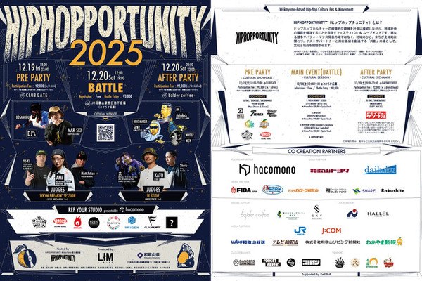 HIPHOPPORTUNITY WAKAYAMA実行委員会は、12月20日(土)、JR和歌山駅西口地下広場(わかちか広場)にて、ヒップホップカルチャーフェス「HIPHOPPORTUNITY(ヒップホップチュニティ) 2025」を開催する。