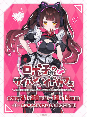 ホロライブ所属0期生バーチャルYouTuber「ロボ子さん」のYouTubeチャンネル登録者数100万人突破を記念してキュアメイドカフェにて、コラボカフェ「ロボ子さんのサイバーメイドカフェ」が11月28日(金)から開催。12月6日(土)、7(日)にはファンミーティングも同時開催される。