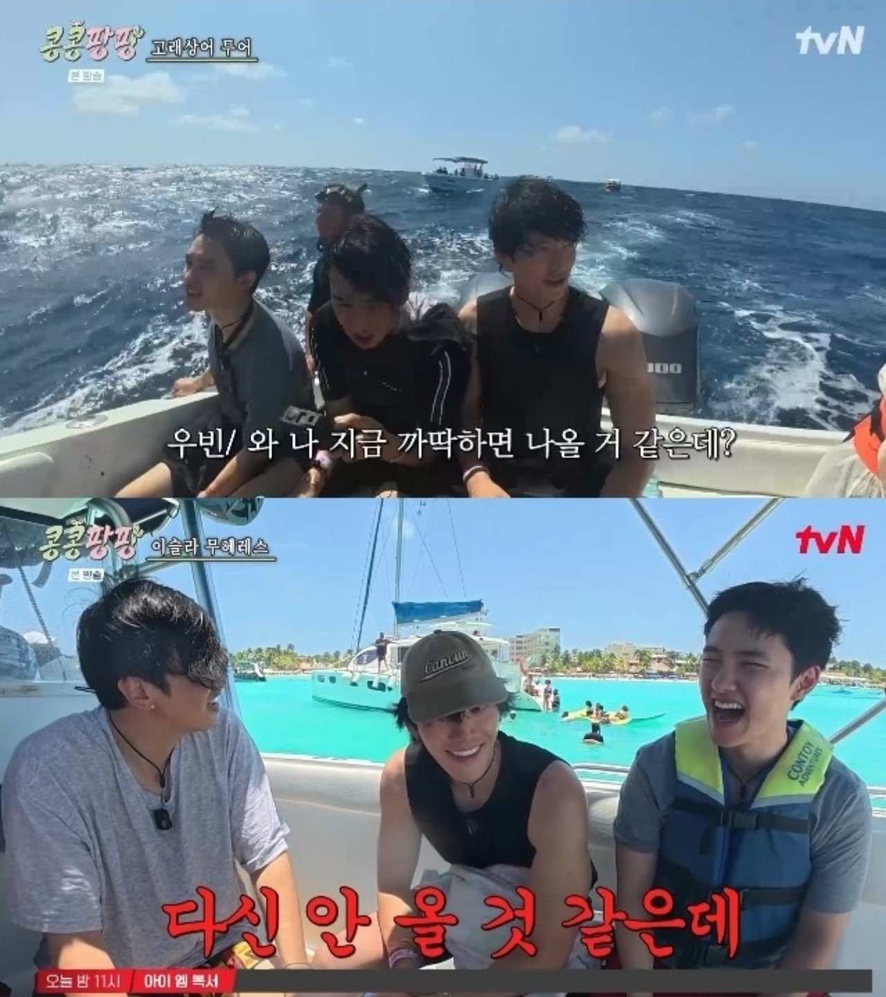 イ・グァンス、キム・ウビン、D.O.は、非現実的な海を鑑賞しながら胸を躍らせて出発するが、次第に荒れ狂う波で船が激しく揺れるにつれ緊張し始めます。 ついには波が船内に押し寄せ、探訪団の荷物が入ったバッグが濡れるだけでなく、力持ちのキム・ウビンも耐えきれず座席から離れる事態に発展しました。