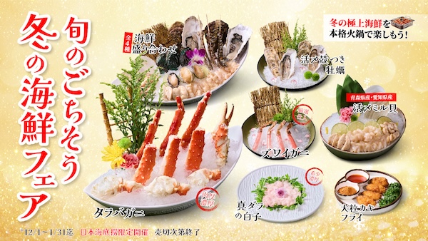 「海底撈火鍋」では、最大限火鍋を楽しんでもらうべく、冬ならではの旨みをたっぷり蓄えた海鮮を厳選し、期間限定メニューとして提供する。数多く存在する冬の海鮮の中でも特に「火鍋」にピッタリの食材を用意し、心まで温まる豪華な海鮮フェアを全国の「海底撈火鍋」で販売する。